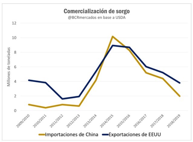 Luego de la imposición de aranceles por parte de China al sorgo proveniente de Estados Unidos, la relación entre el gran exportador y el gran comprador se ha quebrado. China impuso un arancel que llega hasta 178,6% del valor del grano importado. Esto provocó que las exportaciones provenientes de Estados Unidos caigan a los mínimos de las últimas 5 campañas. El siguiente graco muestra como caen las compras de China mientras que las exportaciones de Estados Unidos copian ese guarismo.