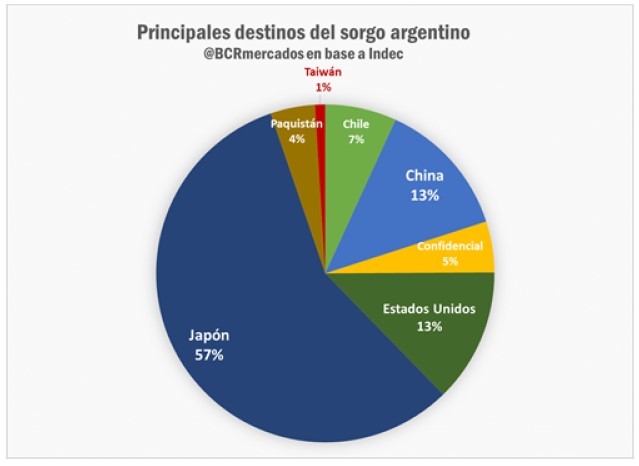 Actualmente, el principal destino de exportación del sorgo argentino es Japón, con una participación del 57% en el promedio de los últimos años del total exportado. Otros destinos que participan regularmente son Estados Unidos, Chile y Taiwán. El caso de las exportaciones a China fue un hecho aislado en 2015.