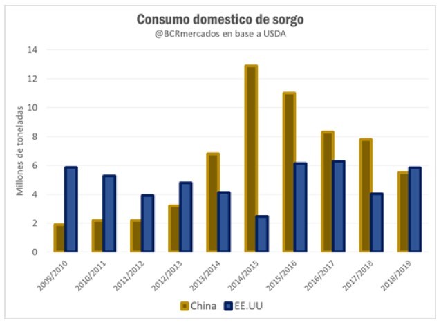 En tanto, el salto interanual en el ítem de alimento humano, semilla e industria del balance del USDA para los Estados Unidos es de 1,7 millones de toneladas, para ubicarse en 3,2Mt. Tal es así, que el consumo de sorgo en Estados Unidos se proyecta en 5,84 Mt y luego de seis campañas vuelve a superar al propio consumo doméstico de China en 5,5 Mt.