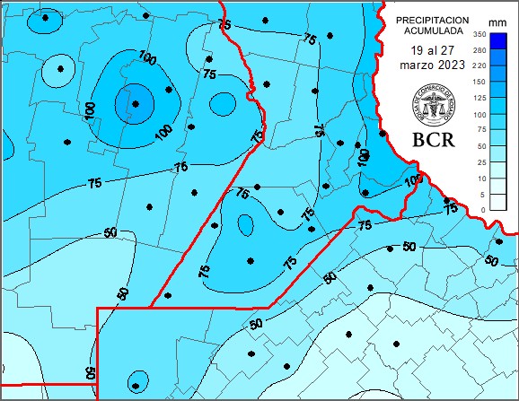 Desde las primeras precipitaciones que comenzaron el 19 de marzo, la región recibió en promedio 73 mm. El mayor registro fue el de Idiazábal (150 mm). Rosario marcó 118 mm y Colonia Almada, 113 mm. En 80% de la región núcleo registró valores que superaron los 50 mm. En la porción norte de la región, con este evento, las lluvias acumuladas de marzo alcanzan la media estadística del mes (entre 100 a 125 mm). Por el contrario, sigue el desconcierto en el noreste bonaerense: en muchas algunas localidades aún no logra superarse los 20 mm. Chacabuco registró solo 16 mm y Junín 18 mm. Queda claro que el evento llega muy tarde para los cultivos de maíz y soja, pero la lluvia hizo volver a pensar en el trigo si se afirma el cambio pluvial del otoño.