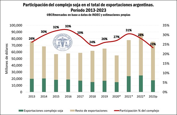 El complejo soja es desde hace tiempo el principal generador de divisas en la economía argentina. La participación del complejo en las exportaciones totales nacionales de bienes alcanzó en el año 2016 un máximo histórico, con el 33% del total exportador; es decir, en dicho año el complejo soja generó 1 de cada US$ 3 en exportaciones del país. A partir de entonces, la participación del sector ha fluctuado, dependiendo de las cosechas y de los precios internacionales, representando en el año 2022 un 28% del total.