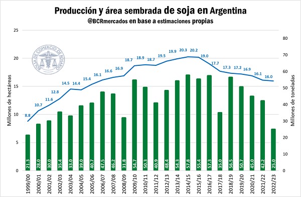 En la actual campaña, se estima que se sembraron 16 millones de hectáreas de soja, ubicándose apenas unas 100.000 hectáreas por debajo de la campaña anterior. La oleaginosa se mantiene como el principal cultivo en área sembrada en el país, aunque mostrando una caída ininterrumpida en las últimas 7 campañas desde del récord de las 20,3 Mha que se sembraron en la 2014/15. El área destinada al cultivo en la 2022/23 representa la menor área sembrada con la oleaginosa desde la 2005/06.