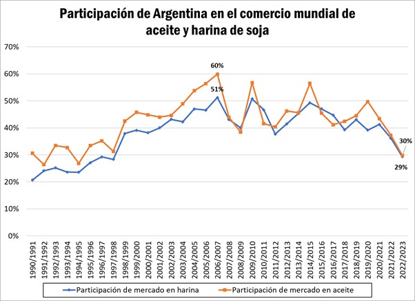 Argentina perdió 30 puntos porcentuales en share de mercado en el mercado mundial de aceite de soja en los últimos 15 años, habiendo tocado un máximo del 60% en la campaña 2006/07; se espera que en la campaña 2022/23 nuestro país represente el 30% del comercio global de este producto, con 3,5 millones de toneladas a exportar (estimación BCR). Esta es la menor participación que ostentará en el mercado mundial de este producto desde la campaña 1994/95.