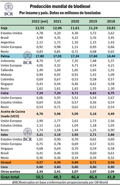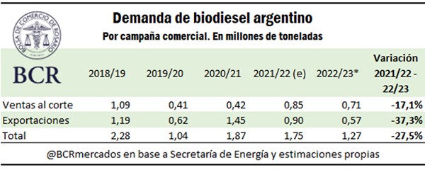 Con este contexto productivo, la producción de aceite de soja, insumo fundamental para la producción de biodiesel en Argentina, caería un 22% y totalizaría 5,5 Mt según las proyecciones BCR para la campaña 2022/23. De esta manera, nos encontraríamos con la menor producción de aceite en quince años.