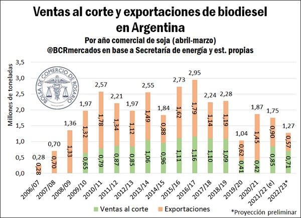 Con este conjunto de factores, las ventas al corte del biodiesel podrían caer un 18%, mientras las exportaciones podrían mostrar mermas del orden del 37%. Ponderando estos dos factores, la demanda de biodiesel podría recortarse más de un 27%. Sin embargo, no debemos dejar de lado que aún restan definirse muchos factores variables que podrían trastocar esta dinámica en los próximos meses: potenciales intervenciones en los mercados, cambios normativos, variaciones en precios relativos, entre otros elementos. Esto necesariamente hace preliminar la proyección 2022/23 del biodiesel argentino. Por supuesto, se aclara que el escenario desarrollado es exclusiva responsabilidad de la Dirección de Informaciones y Estudios Económicos de la Bolsa de Comercio de Rosario.