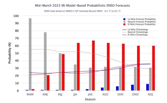 Figura 3: Pronóstico probabilístico de anomalías de Temperatura de la superficie del mar (TSM) en la región Niño 3.4. - Fuente: International Research Institute