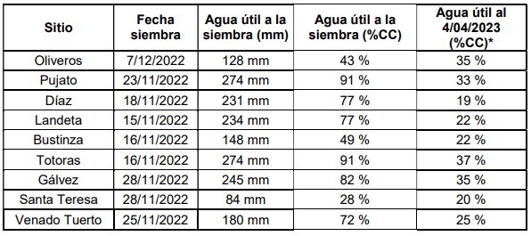 Dado que este modelo contempla la exploración radicular, la evolución del estado hídrico de la soja no dependerá exclusivamente de las lluvias, sino también del agua almacenada en el suelo que es captada durante la exploración radicular. Ahí radica la importancia del muestreo de agua útil, que es saber con cuánta agua partimos para nuestra producción. Para los distintos sitios que participan en la Red (Tablas 1; Figura 1), se puede observar los mm de agua disponible a la siembra, cuanto representan los mismos en porcentaje de capacidad de campo (CC) y el valor de agua útil disponible al 4-04-2023. Las escasas precipitaciones en la región y el consumo de agua por parte de los cultivos explican la baja disponibilidad de agua a la fecha, todos los sitios tienen valores de agua por debajo del límite de estrés (50% CC), condición que reviste de gran importancia ya que las variedades de ciclo largo se encuentran en el periodo de llenado de grano (R6), mientras que las variedades de ciclo corto ya alcanzaron madurez fisiológica (R7).