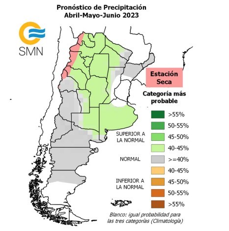 Figura 2: Tendencias climáticas de precipitación para el trimestre abril, mayo, junio 2023. Fuente: Servicio Meteorológico Nacional