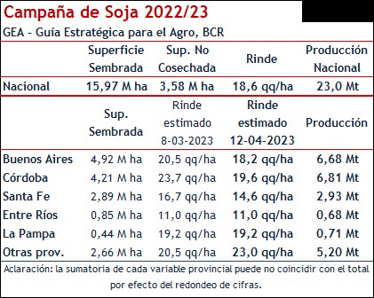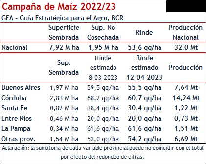 El recorte de marzo a abril es de 3 Mt. Se estima un volumen de 32 Mt, un 40% menos de lo que se esperaba producir a principios de la campaña. El rinde estimado de marzo es de 53,6 qq/ha (57,8 qq/ha en marzo) y es el peor rinde nacional registrado desde el 2008/09.