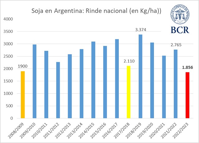 La novena ola de calor que comenzó en los últimos días de febrero y terminó el domingo 19 de marzo fue de por sí un evento climático catastrófico para la soja y el maíz 2022/23. Anteriormente, la campaña se estaba desarrollando sobre el peor escenario climático de al menos los últimos 60 años. Argentina venía sufriendo una sequía sin precedentes desde antes de la siembra. La ola de calor agravó los efectos del estrés termo hídrico llevándolos a un extremo que resulta inédito para el sector. En soja, la pérdida de área pasó de estimarse en 2,68 a principios de marzo a 3,58 M de hectáreas. Los rindes se han desplomado al limitarse aún más el número de granos por metro cuadrado y al afectarse drásticamente el peso de granos. De esta manera se estima en abril un rinde nacional de soja de 18,6 qq/ha (vs 20,3 en marzo). Este es el más bajo de los últimos 15 ciclos productivos de Argentina, quedando incluso por debajo de los 19 qq/ha de la 2008/09.