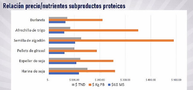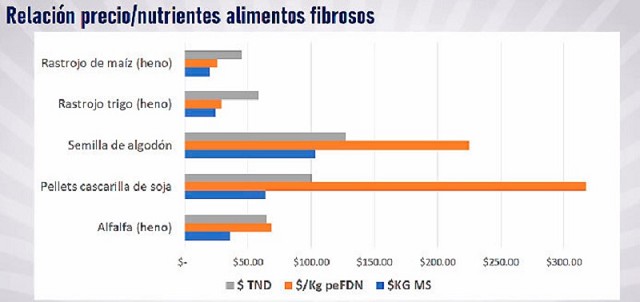 Asimismo, el siguiente cuadro permite una comparación de precios/nutrientes de alimentos fibrosos. Por ejemplo, el pellets cascarilla de soja en la barra naranja es el más caro por kilo FFE pero observamos que tiene una alta digestibilidad (barra gris) y por kilo de MS no están caro como la semilla de algodón.