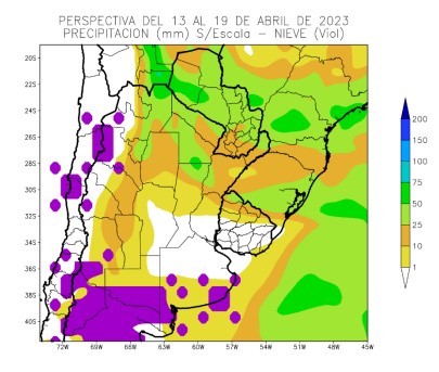 Al comienzo de la perspectiva, se completará el paso del frente de tormenta que inició su recorrido en la etapa anterior, provocando precipitaciones sobre el norte del área agrícola, y nevadas sobre la Cordillera, el norte de la Patagonia y el sur de la Región Pampeana. La masa de aire frío y seco, que acompañará el paso del frente, acentuará el descenso térmico, con riesgo de heladas localizadas en las zonas cordilleranas y serranas, incluyendo las serranías bonaerenses.
