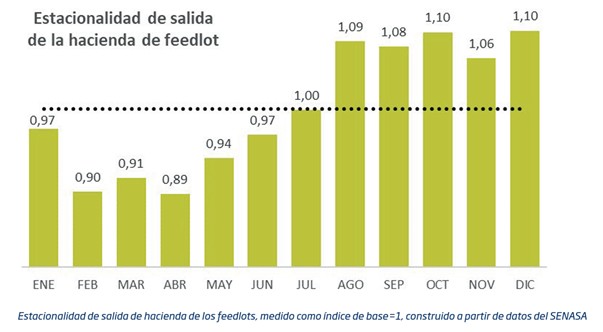 En un año normal, los feedlots comienzan a llenarse a partir de los meses de abril-mayo alcanzando su nivel máximo de ocupación durante el trimestre junio-julio-agosto, para comenzar a descargar esta hacienda terminada con mayor presión durante la segunda mitad del año.