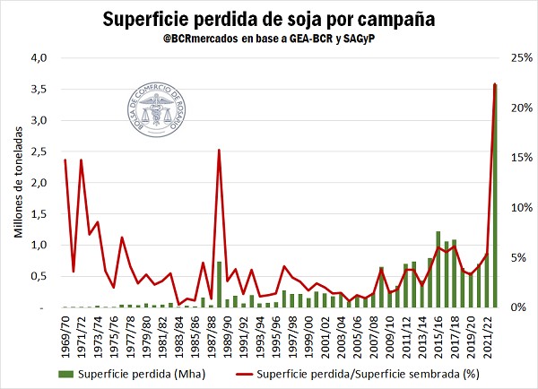 Pero la campaña que acaba de comenzar deja otros varios hitos negativos desde el punto de vista productivo. Según informa GEA, la superficie perdida (es decir, el área que directamente no será cosechada) alcanza la friolera suma de 3,58 Mha. Esto marca un máximo histórico para el país y prácticamente triplica el máximo anterior de la 2015/16 (1,22 Mha). Incluso, hay que remarcar que, en aquel entonces, la superficie sembrada a nivel nacional superaba las 20 Mha, mientras que en este último ciclo el área implantada alcanzó cerca de 16 Mha, por lo que la superficie perdida sobre el total implantado en este último ciclo es mucho mayor: 22% vs. 6% en aquel entonces. Tomando este indicador, es decir superficie perdida sobre superficie sembrada, la 2022/23 también marca un máximo histórico, quedando por encima del 16% de la 1988/89.