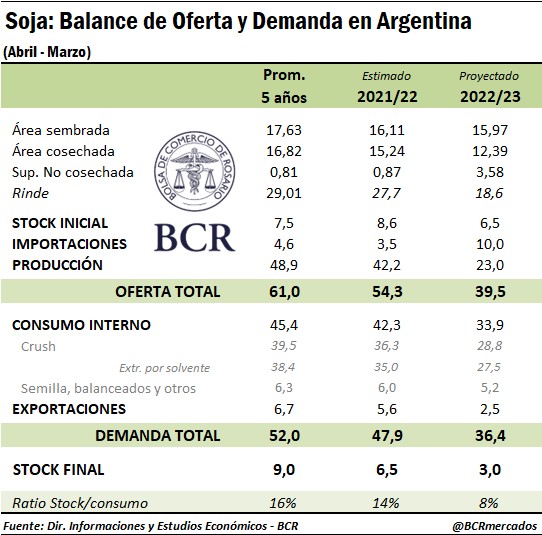 Además, el bajo volumen de molienda de soja de los últimos meses arroja un leve recorte en la estimación de crush de la 2021/22 que se traduce en un incremento en las previsiones de carry entre campañas a 6,5 Mt (+0,5 Mt respecto de lo que se estimaba anteriormente). Así, la caída en la producción es en parte compensada por un mayor stock inicial y mayores importaciones, por lo que la oferta total de la campaña se recorta en 1 Mt vs. la estimación previa.