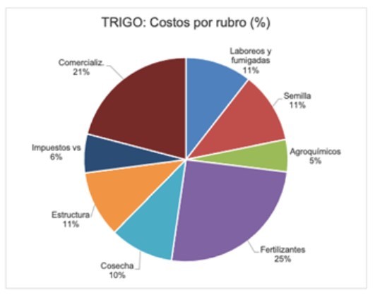 Hace un año, el costo de los fertilizantes en un planteo triguero era de 362 US$/ha, el cual disminuyó 189 US$ en este último año, ejerciendo en paralelo un fuerte descenso de los costos totales. Otro rubro que bajó son los agroquímicos, en menor medida, al pasar de 44 a 35 US$/ha, mientras que los rubros restantes como labores, semillas, cosecha estructura, impuestos y comercialización aumentaron ligeramente.