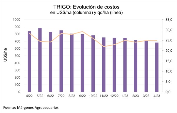 Para un planteo triguero en el Sudeste de Buenos Aires, los costos medidos en dólares, bajaron notablemente en comparación a un año atrás en donde se situaba alrededor de los 840 US$/ha frente a los 683 US$/ha actuales, siendo el rubro fertilizantes el de mayor gravitación en la baja de costos.