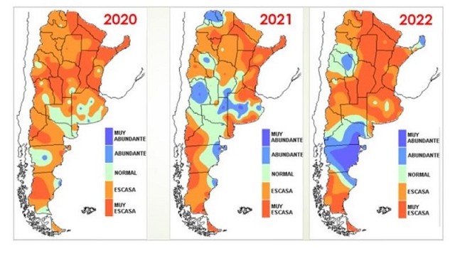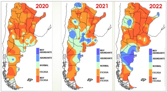 Cuando en 2020 se afianzaban los pronósticos de La Niña, todo el sistema agropecuario avizoraba una señal negativa para la producción. Ya en 2019, se había comenzado a sentir fuerte la bajante de los ríos, algo que recién comienza a transitar una recuperación sostenida. También, por entonces, los perfiles de suelo todavía eran un reservorio de agua al cual los cultivos recurrieron para moderar las mermas en los rendimientos. La continuidad del indicador climático negativo durante 2021, profundizó la extracción de agua de los perfiles y cuando ingresamos al otoño de 2022, el intenso frío temprano, confirmó que el peor año aún no había llegado. Hoy a la salida de este trienio, que será difícil de olvidar en la zona núcleo, apenas comenzamos a ver la salida de la sequía, aunque aún en muchos sectores, los perfiles no están en condiciones razonables para lograr un inicio favorable para los cultivos de invierno. Los mapas de anomalía anuales de la precipitación sirven como resumen de este período tan complejo que ha tenido que transitar el sector productivo.