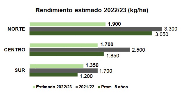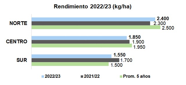 Centro-este: El rendimiento fue 1.950 kg/ha (media mín: 1.700 kg/ha - media máx: 2.500 kg/ha), 3% inferior a la campaña 2021/22.