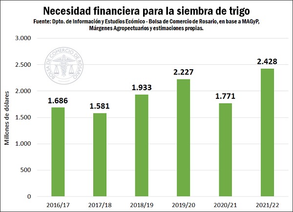 Mirando la historia reciente, si se deja de lado el desembolso necesario para sembrar la campaña 2022/23 (fatídica en cuanto al alto valor de los insumos que se combinó con una muy baja productividad), se puede ver que en los cinco ciclos precedentes el productor argentino necesitó, en promedio, más de US$ 1.800 millones para sembrar trigo.