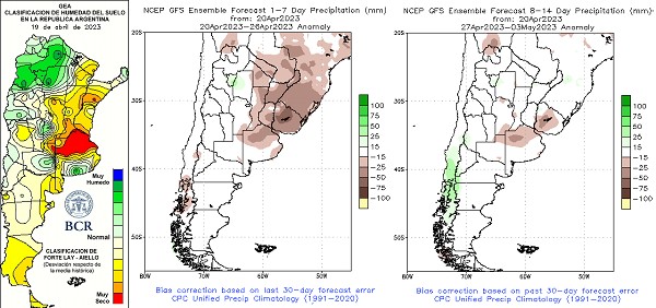 En relación con las recargas de humedad de suelo, pese a los pronósticos que indicaban que a partir del otoño se destrababan las lluvias, éstas no han alcanzado en milímetros y cobertura para satisfacer el agudo déficit. La imagen que sigue muestra, sobre la izquierda, el mapa de clasificación de reservas de humedad del suelo elaborado por GEA-BCR, y las dos siguientes el mapa de anomalías de lluvias tal como surge del pronóstico para los próximos 7 días primero, y para los siguientes 7 después, ambos en base a lo reportado por la National Oceanic and Atmospheric Administration dependiente del Departamento de Comercio de los Estados Unidos. La zona del norte de Buenos Aires, epicentro de la sequía, exhibe al 20 de abril, un pronóstico para los próximos 15 días que la muestran con ausencia de lluvias, con anomalías que superan los 50 mm por debajo de la media histórica.