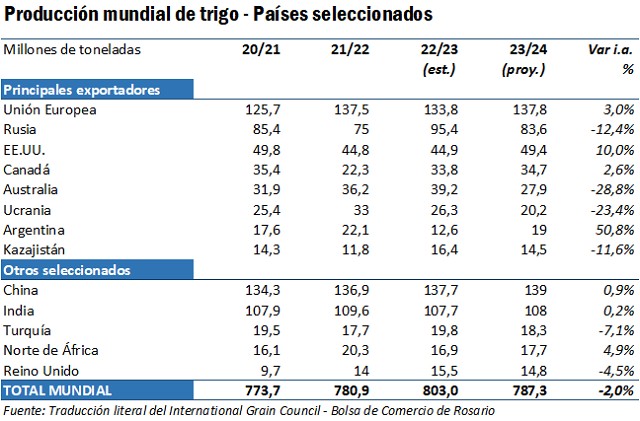 En cuanto a las hojas de balance a nivel mundial, el International Grain Council (IGC) publicó su último informe mundial donde ya se consideran proyecciones para la nueva campaña 2023/24. Se proyecta una caída del 2% en la producción mundial de trigo, a 787,3 Mt, pero igualmente estaría por encima del promedio. En cuanto al consumo mundial, se espera un acotado crecimiento hasta 794 Mt, nivel por encima de la producción. Esto redunda en una caída de stocks finales respecto al ciclo previo, quedando en 277 Mt (↓7 Mt).