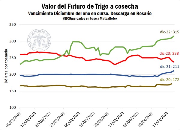En concordancia, el precio del futuro DIC23, entrega en los puertos de Rosario, en Matba-Rofex alcanzó un máximo relativo de US$ 268/t el 14 de febrero, para cerrar la semana en curso a US$ 238/t. Si bien este valor se encuentra muy por debajo de los US$ 315/t que tocó el trigo a esta altura del año anterior, condicionado por el estallido de la Guerra entre Rusia y Ucrania, este valor se encuentra aún por encima de los vigentes a abril del 2020 y 2021, tal como muestra el gráfico adjunto.