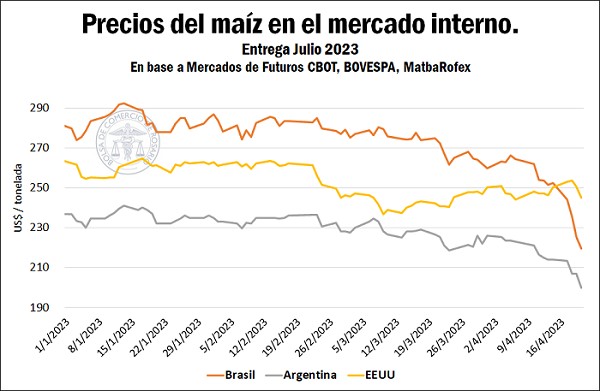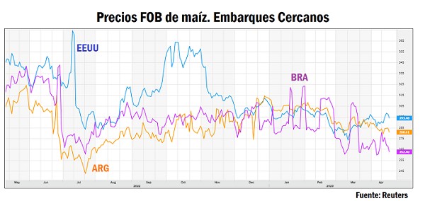 En el gráfico siguiente vemos la caída que vienen experimentando los precios FOB de Argentina, a medida que nos vamos adentrando en la campaña comercial, y vemos la buena competitividad que tiene el maíz brasilero aún previo a la entrada de la safrinha.