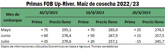 La dura caída en las primas de exportación limita la capacidad de pago del sector exportador a los productores nacionales. Al 30 de marzo, según datos de brokers fob, los embarques desde el Up-River de Rosario para los meses de mayo y julio estaban operando con primas de + 75 y +35 por bushel por sobre la base de Chicago, mientras que, para el 19 de abril, las mismas posiciones estaban operando ya con primas de + 25 para la entrega en mayo, y con primas negativas de entre -10 y -15 por bushel para la entrega en el mes de julio.