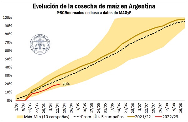 El avance de la cosecha de maíz en la última semana fue exiguo, mostrando un avance de 2 puntos porcentuales sobre el total de área sembrada según datos de SAGyP. Los productores se volcaron mayormente a la trilla de soja en los últimos 7 días, cosecha que avanzó 10 p.p. en el período, hasta alcanzar el 19% del total. Así, la cosecha de maíz de la campaña 2022/22 avanzó sobre el 20% del área sembrada a fecha del 20 de abril