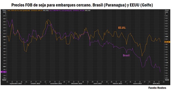 Brasil se encuentra sumamente competitiva en los mercados globales. Las primas portuarias de la soja brasileña han caído a mínimos históricos en los últimos días en un contexto de tibia demanda china, mientras el país se aproxima a terminar la trilla. Las primas cayeron a su punto más bajo en 19 años, según datos de Cepea/Esalq, bajando hasta -200 puntos básicos por bushel esta semana en puertos como Paranaguá para los embarques de mayo.