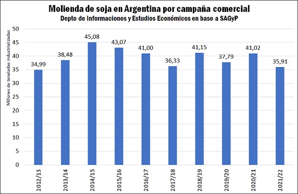 Con estos datos, podemos cerrar los números de la campaña de la industria aceitera 2021/22 (abril-marzo). En total, se molieron en nuestro país a lo largo de la misma un total de 35,9 millones de toneladas de soja, cayendo un 12% con respecto a la campaña 2020/21 y siendo el menor volumen procesado por esta industria desde la campaña 2012/13. Los números para el nuevo ciclo no son auspiciosos, esperando que la molienda se ubique por debajo de los 29 millones de toneladas a lo largo de la campaña.