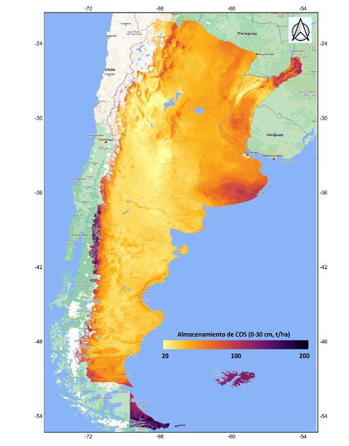 Figura: Mapa de INTA de COS actual (t/ha, 0-30 cm) en Argentina.