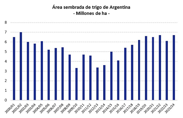 Fuente: BCCBA en base a USDA De acuerdo con el último reporte de Geoglam, el estado del cultivo en los principales países productores es favorable, con algunas situaciones de sequía en Canadá, Estados Unidos y Ucrania, lo cual se refleja en el volumen de producción récord esperado. Al igual que en la campaña pasada, el conflicto entre Ucrania y Rusia es la principal fuente de incertidumbre en el mercado del cereal. La producción ucraniana de trigo se ubicaría en 21 millones de toneladas, 12 millones de toneladas menos que en el ciclo 2021/22. En Argentina, de acuerdo con la Bolsa de Cereales de Buenos Aires, la intención de siembra de la campaña 2023/24 presenta un crecimiento de 600.000 hectáreas respecto al ciclo previo, alcanzando una superficie de 6,7 millones de hectáreas, como consecuencia de mejores condiciones de humedad en los suelos. Este valor, junto a la campaña 2021/22, es el segundo más alto de los últimos 22 años. las compras de trigo por parte de la industria y la exportación han alcanzado 8,2 millones de toneladas contra los 18,4 millones de toneladas promedio para igual fecha. En relación con la cosecha 2022/23, se ha comercializado el 65% de la producción cuando el promedio para el período analizado es del 74%. Con exportaciones estimadas en 4,75 millones de toneladas (versus 15,4 millones de toneladas de la campaña previa, al sector exportador se encuentra sobrecomprado en 1,2 millones de toneladas, mientras que los molineros aún deben adquirir 4,2 millones de toneladas.