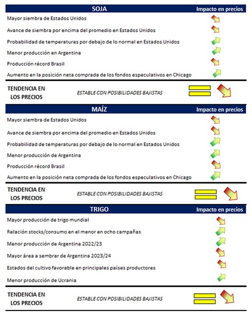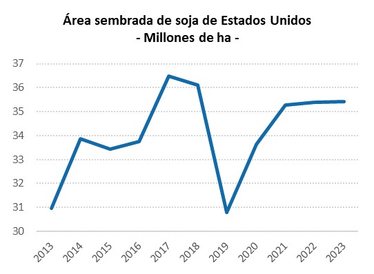 El 31 de marzo pasado, el Departamento de Agricultura de los Estados Unidos publicó el reporte de siembra, donde la superficie de soja subiría sólo 22.260 hectáreas en relación con el ciclo previo y alcanzaría 35,4 millones de hectáreas. La siembra ha comenzado con un avance del 4% de la superficie estimada, por encima del 1% promedio. En relación con las existencias finales de la campaña 2022/23, terminarían en el menor nivel en siete campañas producto de un menor volumen producido y un incremento en la molienda local.