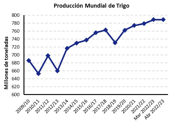 La producción mundial de trigo ha subido 100.000 toneladas en el último reporte de oferta y demanda del USDA, con una proyección récord de 789 millones de toneladas. El consumo mundial, por su parte, ha sido incrementando en 2,9 millones de toneladas, reduciendo las existencias finales. Como consecuencia, la relación stocks/consumo fue corregida a la baja y se ubica en el nivel más bajo de las últimas ocho campañas. ImagenLocal.png