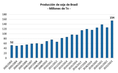 En Brasil, la Compañía Nacional de Abastecimiento aumentó la estimación de producción en poco más de 2,2 millones de toneladas, ubicándola en 153,6 millones de toneladas. De esta manera, la producción sería la récord y subiría en 28 millones de toneladas respecto al ciclo 2021/22 (más que lo estimado para Argentina en la presente campaña). La mayor cosecha obedece a a una expansión en el área sembrada y a mayores rendimientos, que alcanzaron en promedio los 35,3 qq/ha a nivel nacional. Para dimensionar el crecimiento de la oleaginosa en Brasil cabe resaltar que, en 20 años, la producción de soja se triplicó.