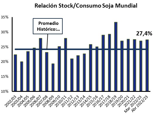 A nivel mundial, la producción de soja fue recortada en 5,5 millones de toneladas a 369,6 millones de toneladas como consecuencia de una menor cosecha esperada en Argentina y Uruguay. A pesar de ellos, la producción mundial de soja sería récord impulsada, principalmente, por Brasil. Por el lado de la demanda, el consumo global fue recortado en 5,3 millones de toneladas frente a la estimación de marzo. De esta manera, las existencias finales subirían 300.000 toneladas, lo cual provoca que la relación stocks/consumo aumente, aunque se mantiene levemente por debajo del ciclo pasado.