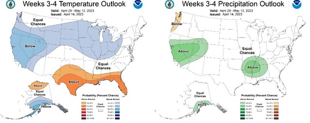 Fuente: BCCBA en base a USDA Para las próximas semanas, se espera que las temperaturas en las principales zonas agrícolas de Estados Unidos sean más frías de lo habitual con precipitaciones que podrían presentarse en torno al promedio, lo cual podría generar algunas complicaciones en la siembra tanto de soja como de maíz.