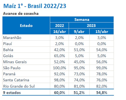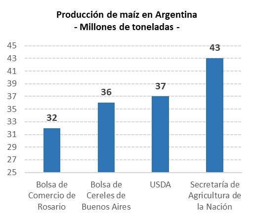 En Argentina, la cosecha presenta un grado de avance del 18%, 3 puntos porcentuales por debajo a de igual fecha del año anterior y del promedio de los últimos cincos años. Los primeros lotes cosechados demuestran los efectos negativos de la sequía sobre el cultivo, con rendimientos que se ubican en los niveles más bajos de los últimos años. En el caso de los maíces tardíos, las heladas tempranas producidas a mediados de febrero también tuvieron un efecto negativo en el rendimiento. En este contexto, las previsiones de organismos públicos y privados presentan diferencias, donde la Bolsa de Comercio de Rosario es la más pesimista con una cosecha de 32 millones de toneladas, mientras que la Secretaría de Agricultura de la Nación presenta la estimación más elevada con 43 millones de toneladas.