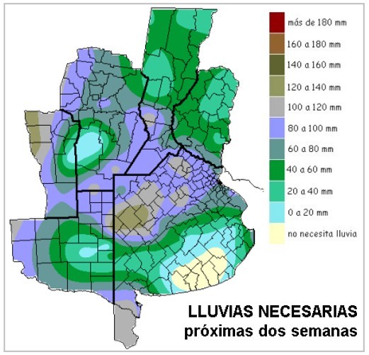 El número mágico para el inicio de la campaña es el 80. Con pocas pretensiones, serían necesarios unos ochenta milímetros para que los perfiles recuperen un nivel aceptable de humedad. Esto lo podemos ver en el mapa que estima las lluvias necesarias para alcanzar reservas adecuadas para una pastura, quizá implantar un trigo podría arreglarse con menos, pero es una referencia razonable.