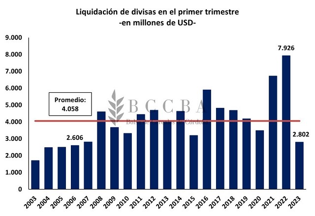 De acuerdo con los datos publicados por el CIARA-CEC, el primer trimestre del corriente año se presenta como uno de los más preocupantes de los últimos 17 años, dado que la liquidación de divisas se ubicó en un valor de USD 2.802 millones, siendo el valor más bajo desde el año 2006. Con respecto al primer trimestre del 2022 presentó una caída del 65% de los ingresos, además de encontrarse 31% por debajo del promedio de los últimos 20 años. En lo que va del año, febrero fue el mes que presentó la cifra más baja de ingreso de divisas, USD 645 millones, correspondiéndose también con el monto de liquidación más bajo desde febrero de 2005.