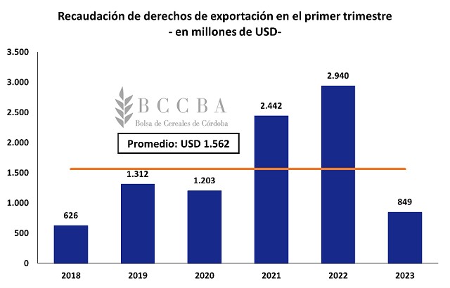 Según datos de la Administración Federal de Ingresos Públicos (AFIP), en el primer trimestre del corriente año se han recaudado USD 849 millones en concepto de derechos de exportación. Esto implicó una caída del 71% con respecto al mismo periodo del año pasado, donde la recaudación fue de USD 2.940 millones. Respecto al promedio de los últimos 6 años, este se encuentra un 46% por debajo, siendo el menor valor desde el año 2018.