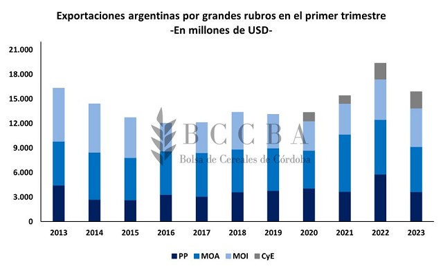 En el primer trimestre del 2023 las exportaciones argentinas alcanzaron los USD 15.888 millones, presentando una variación porcentual negativa del 18% respecto al primer trimestre de 2022, sin embargo este periodo se encuentra entre los 4 mejores en cantidad de divisas que ingresaron al país. El motivo es que, los mayores precios internacionales compensaron en parte las menores cantidades exportadas.