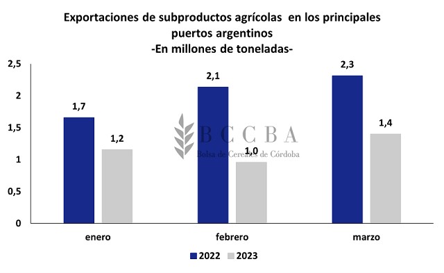 Respecto a la exportación de subproductos, que comprende pellet de trigo, de girasol, de soja y malta, sufrió una caída del 42% interanual, lo que implican 2,6 millones de toneladas menos. El mes de febrero fue el que experimentó la mayor disminución, un 55% menos en comparación con febrero de 2022.