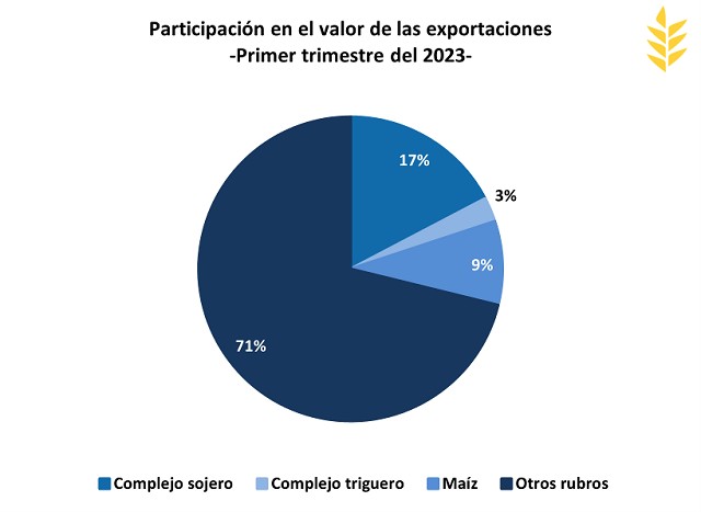 Del total de las exportaciones, el 17% se correspondieron al complejo sojero, el 9% al maíz y el 3% al complejo triguero. La suma de los complejos ha pasado de representar un 45% en el primer trimestre del 2022, a un 29% en el primer trimestre del 2023.