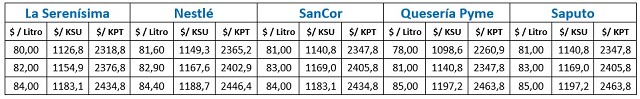 En la cuenca oeste de Bs. As., para una leche libre de brucelosis y tuberculosis, con 3.65 grasa y 3.45% proteína, 25.000 UFC, 300.000 CCS y remitida a 4.0 ºC. Se trata de una estimación genérica y -como tal- sólo orientativa, referida a algunas de las principales empresas que operan en la región. Se toma “anillo 2” de planta Gral. Rodríguez de La Serenísima. La 1º fila se refiere a un tambo de 2000 litros / día, la 2° corresponde a un tambo de 5000 litros / día y la 3º hace referencia a un tambo de 10000 litros / día. Los precios se expresan en $/Litro, $/KSU (Kg de sólidos útiles) y $/KPT (Kg de proteínas totales). EN LA DISPERSIÓN DE PRECIOS SE UBICAN POR ENCIMA DE LO PUBLICADO LO OBTENIDO POR GRUPOS DE COMERCIALIZACIÓN O EN ARREGLOS ESPECIALES ES UN % VARIABLE Y DINÁMICO, QUE ES COMPLEJO RELEVAR Y ESTIMAR EN FORMA FIDEDIGNA Y REGULAR.