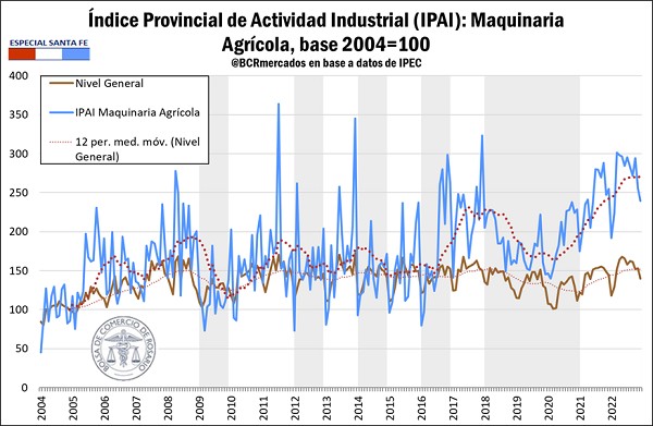 Además, cuando se compara la evolución del sector con el Nivel General del índice (línea marrón del gráfico que sigue), se observa que el sector tuvo un desempeño superior al resto de las actividades productivas. De hecho, la variación interanual acumulada del índice general arroja un crecimiento del 5,1% en el último año en la provincia, mientras que el sector maquinaria agrícola en particular indica un acumulado interanual del 11,1%.