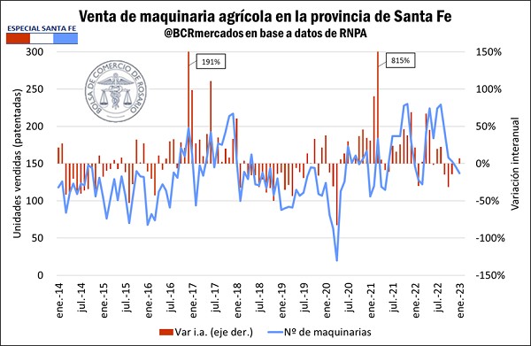 Acorde con esto, los datos de ventas de maquinaria agrícola en la provincia (que también incluyen maquinaria importada) exhiben un incremento interanual de 5,3% en las unidades vendidas con relación al año 2021, aunque con variaciones interanuales dispares, registrando 5 meses de caída y 7 de incrementos. No obstante, hay que tener en cuenta que 2021 fue, de igual manera, un año de fuerte capitalización para el sector. Si bien el año 2023 comienza con una variación interanual positiva para enero, las perspectivas no son claras y dada la sequía y el deterioro macroeconómico, podría esperarse que el sector ralentice su desenvolvimiento.