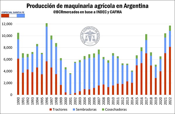 En el último año, el sector de maquinaria agrícola exhibió un notable desempeño. Con casi 12.000 unidades producidas a nivel nacional (entre tractores, sembradoras y cosechadoras), la producción de este sector fue la más alta desde 1996, superando el volumen alcanzado en 2021, que hasta ahora ostentaba el mejor registro del presente milenio. La mejora en la rentabilidad del agro producto de la suba de los precios internacionales de los principales commodities explican parte de esta suba.